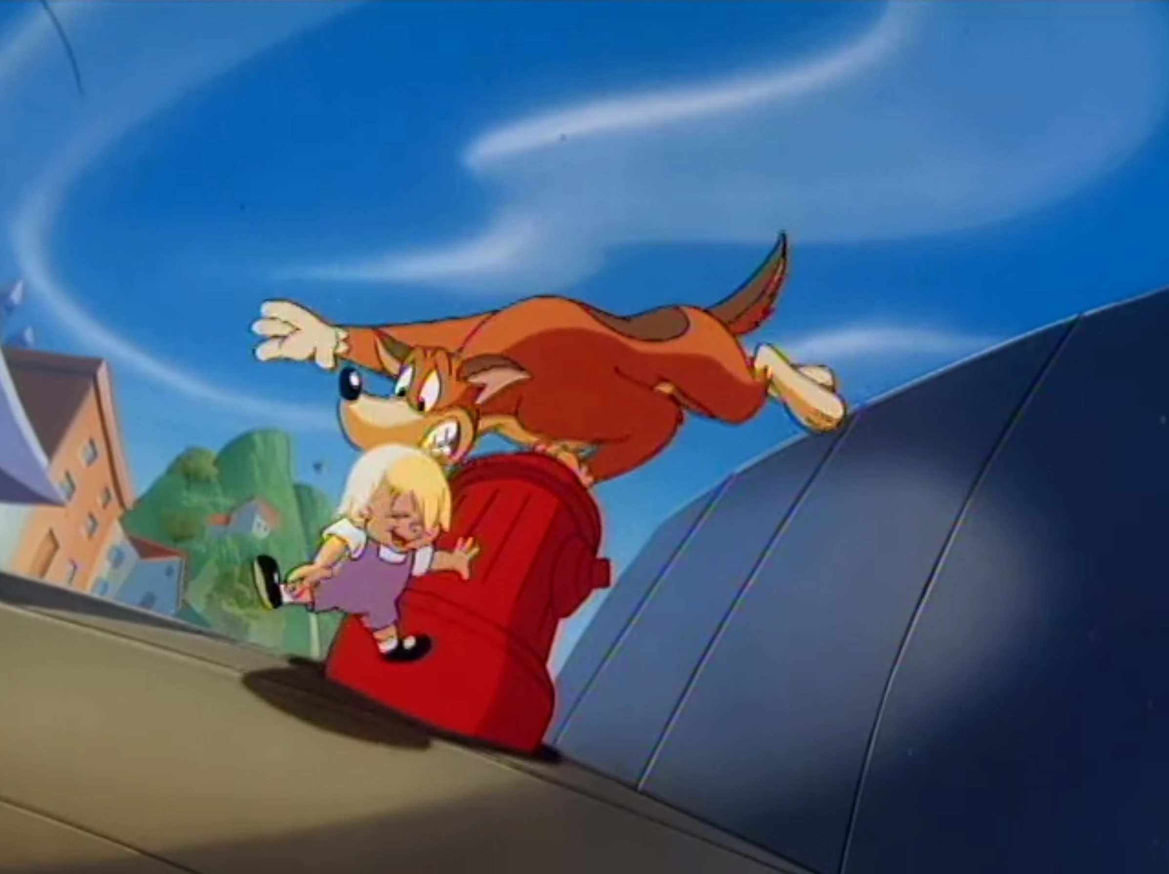 Buttons follows Mindy through the forest and then across a breaking bridge, where he saves her from falling and then is stepped on by the Hip Hippos. He then ends up falling into Dr. Scratchansniff's elixir cart, where he meets Rita and Runt. After they begin to be shot at by Baron von Plotz and Ralph, the three of them discover a mixture of the elixir that explodes, and excitedly throw it at their attackers, which causes a crash. Following the crash, Buttons watches in confusion as Runt refers to Rita as a dog, and then is relieved when Slappy brings Mindy back over to him.