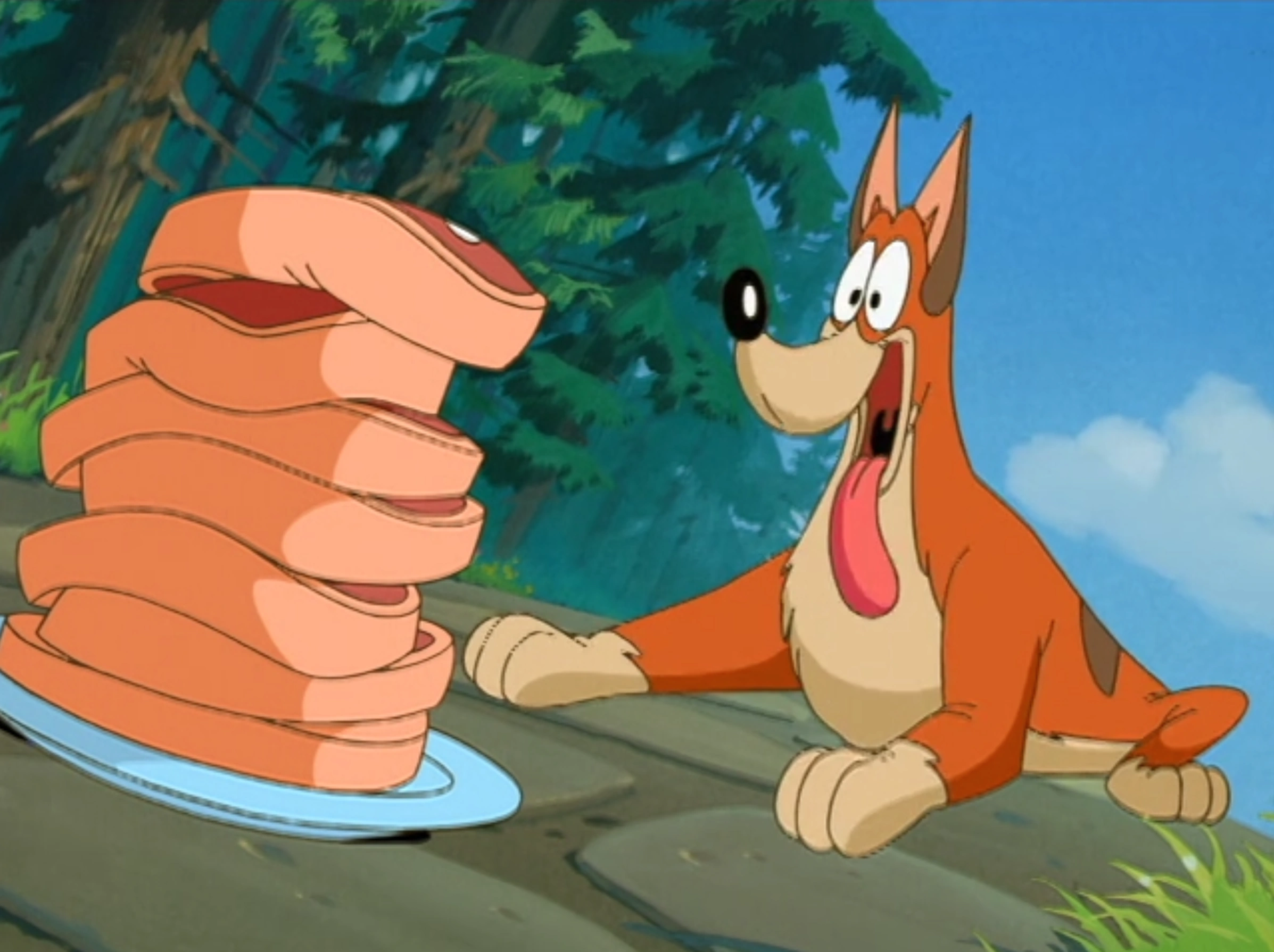 Buttons notices his lack of food as Mindy builds a snowman, and her mother soon arrives and asks Mindy to take a pie to her grandmother at the retirement village, telling Buttons he can eat after he chaperones her there and back. However, as soon as she goes inside to bake cookies for the seven dwarfs, Mindy turns around and gives the pie to Buttons. He excitedly eats it, before realizing that Mindy has scampered into the trees to chase Slappy and Skippy Squirrel; when he attempts to follow, she reminds him that dogs can't climb trees and he falls.