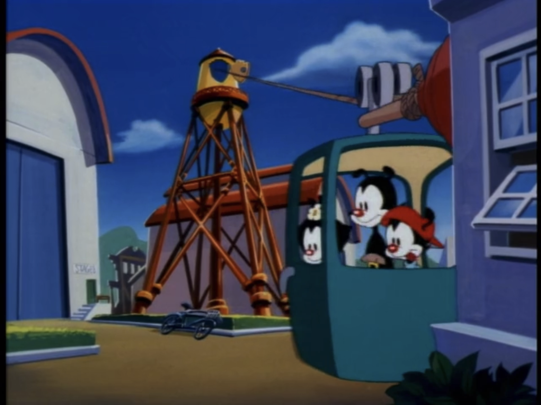 The Warners escape from the water tower via a sky gondola.
