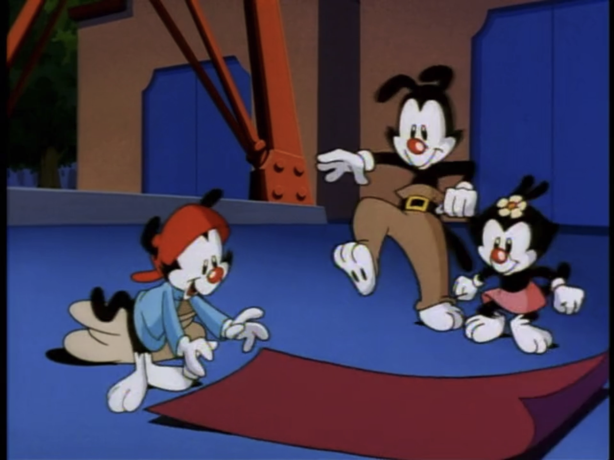 The Warners return to the water tower via a magic carpet from Wakko's magical gag bag. When Ralph attempts to fly on the carpet, an anvil falls on him. The Warners just shrug and go back into the tower.