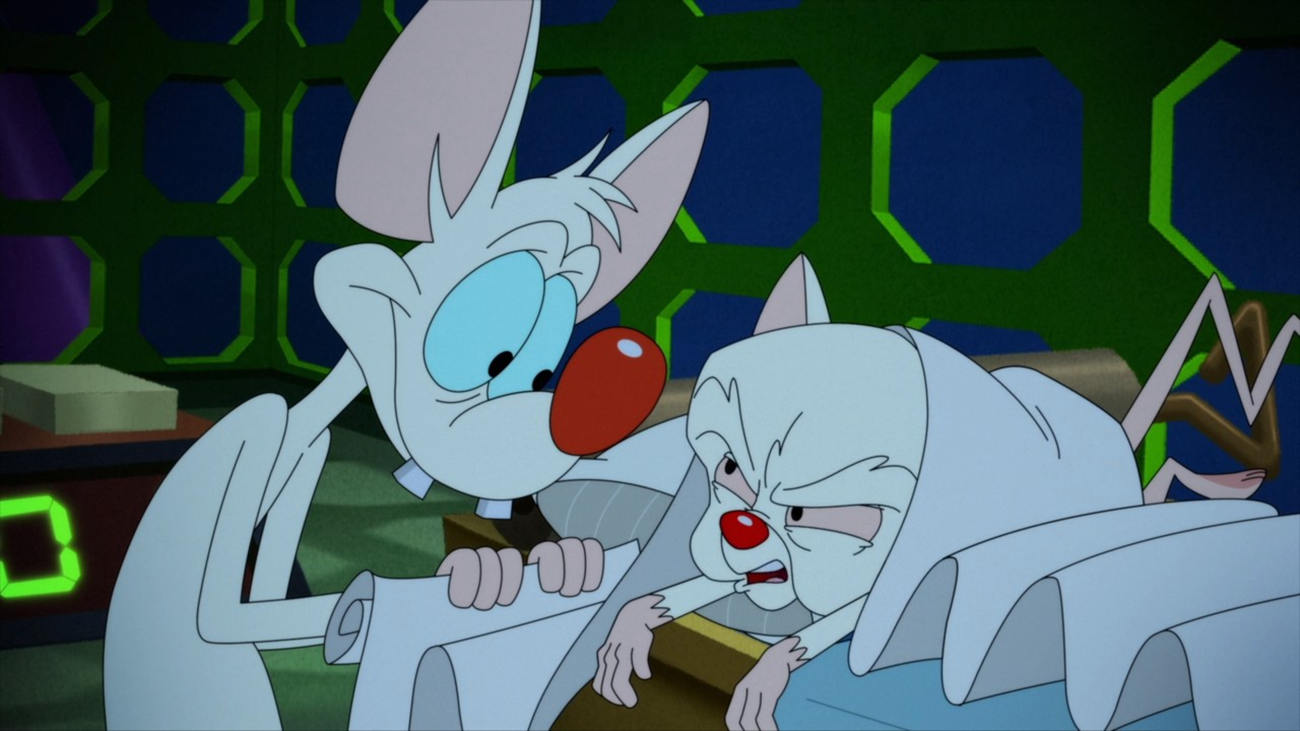 - In deleted storyboards by Lisa Vandenberg; Brain was going to kiss Pinky near the end of the cartoon. In a now deleted post from Lisa's Tumblr blog "Geezerflakes"; it is stated that the scene had to be removed from the finished episode as the mandates dictated that "Brain wouldn't outright give Pinky affection at this point in the show" unless he thought Pinky wouldn’t notice.[3]
